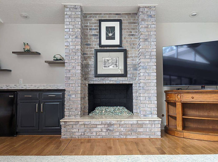 Whitewashed custom color on the fireplace bricks. Also done at this location were the bar cabinets, the surrounding area walls and the bar top.